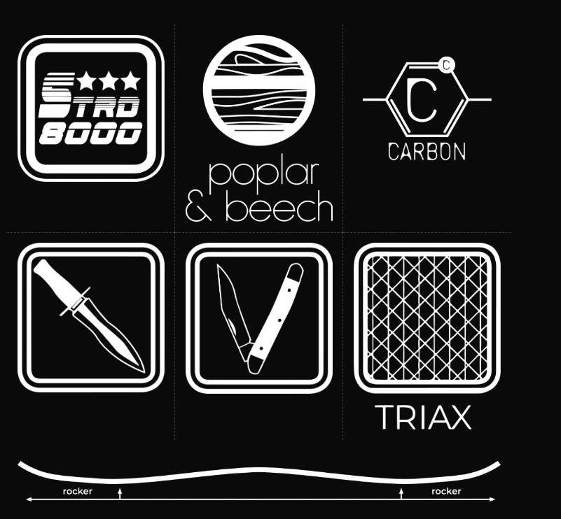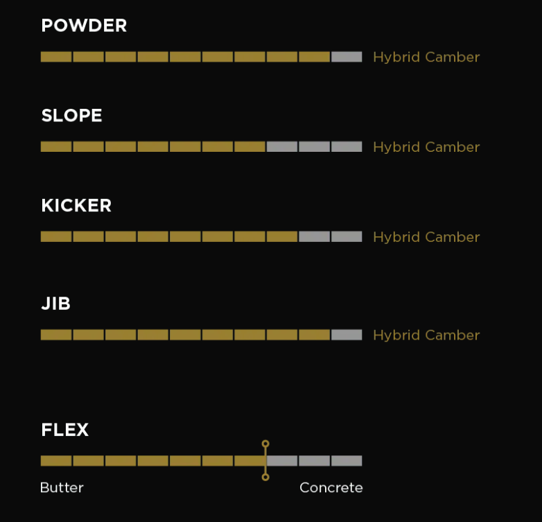 Hybrid Camber – camber onder de voeten met een milde rocker die verder richting nose en tail start. Dit vergroot de effectieve edge voor extra controle op harde sneeuw, terwijl het board float en speelsheid behoudt in poeder en bij freestyle tricks.