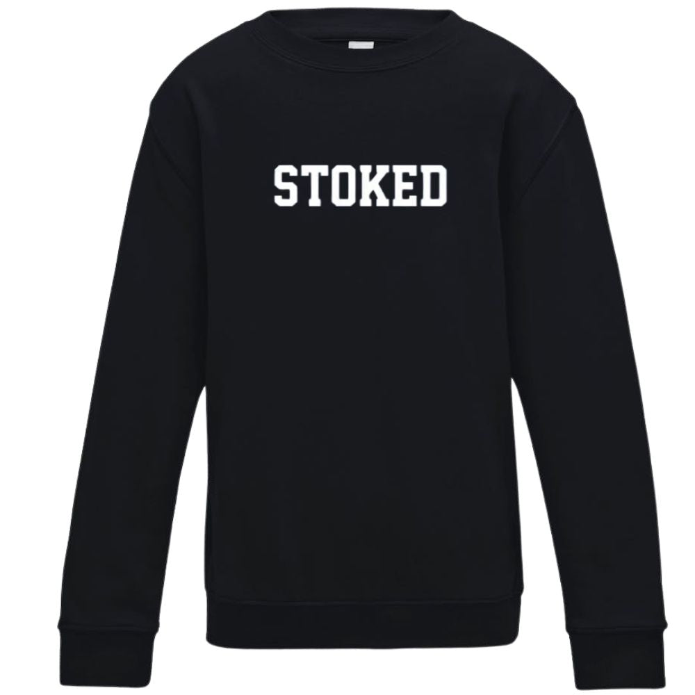 Met de Kids Maxi Script Sweater Deep Black van Stoked Board Co represent je jouw favoriete boardmerk met classy style. Het Stoked Script logo groot op de borst laat zien hoe hyped jij bent en geeft een mooi contrast op de sweater. Een comfortabele neklijn en zachte binnenkant maken deze sweater helemaal af.