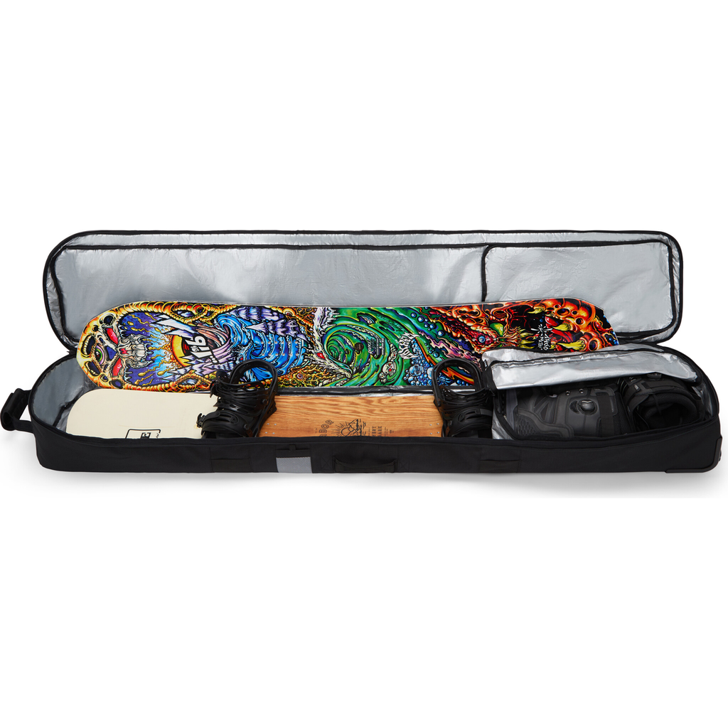 Die Dakine Low Roller Snowboard Bag - Black ist der perfekte Reisebegleiter für Wochenendtrips in die nahegelegenen Berge und wochenlange Abenteuer. Diese Tasche bietet vollen Schutz mit 360-Grad-Polsterung, so dass Ihr Snowboard(s), Ihre Schuhe und Ihre Oberbekleidung sicher verstaut sind. Das Hauptfach bietet Platz für ein Snowboard mit montierten Bindungen oder zwei Snowboards ohne Bindungen sowie eine abnehmbare Schuhtasche. Die Tasche verfügt über eine externe Reißverschlusstasche für wichtige Gegenstände und einen Griff, der in Verbindung mit Rollgepäck einen einfachen Transport mit einer Hand ermöglicht. Die robusten Urethan-Räder rollen problemlos durch Flughäfen und Parkhäuser.