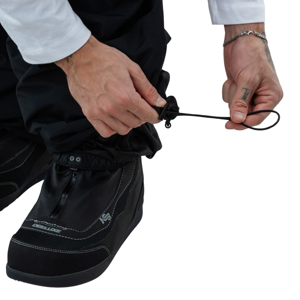 Extras: Verstellbarer Bund mit leicht verstellbaren Schiebern, Stiefelgamaschen mit rutschfestem Gummizug, verstärkte Knöchel und Reißverschlusstaschen zur sicheren Aufbewahrung.