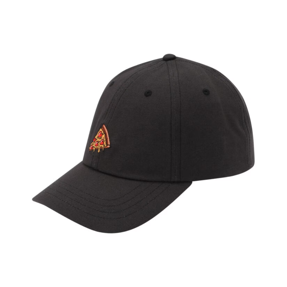 Schwarze Mütze mit verspielter Pizza Love-Stickerei auf der Vorderseite.