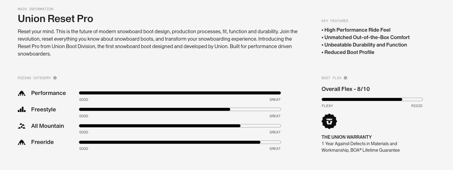 Die Union Reset Pro White/Black Snowboard Boots wurden für Rider entwickelt, die nicht nur Performance, sondern auch Komfort erwarten. Deshalb gehen wir etwas tiefer in die technischen Daten ein: Flex, Schnürsystem, Fußbett, Sohle, Bindungskompatibilität und für welche Rider dieses Modell geeignet ist.