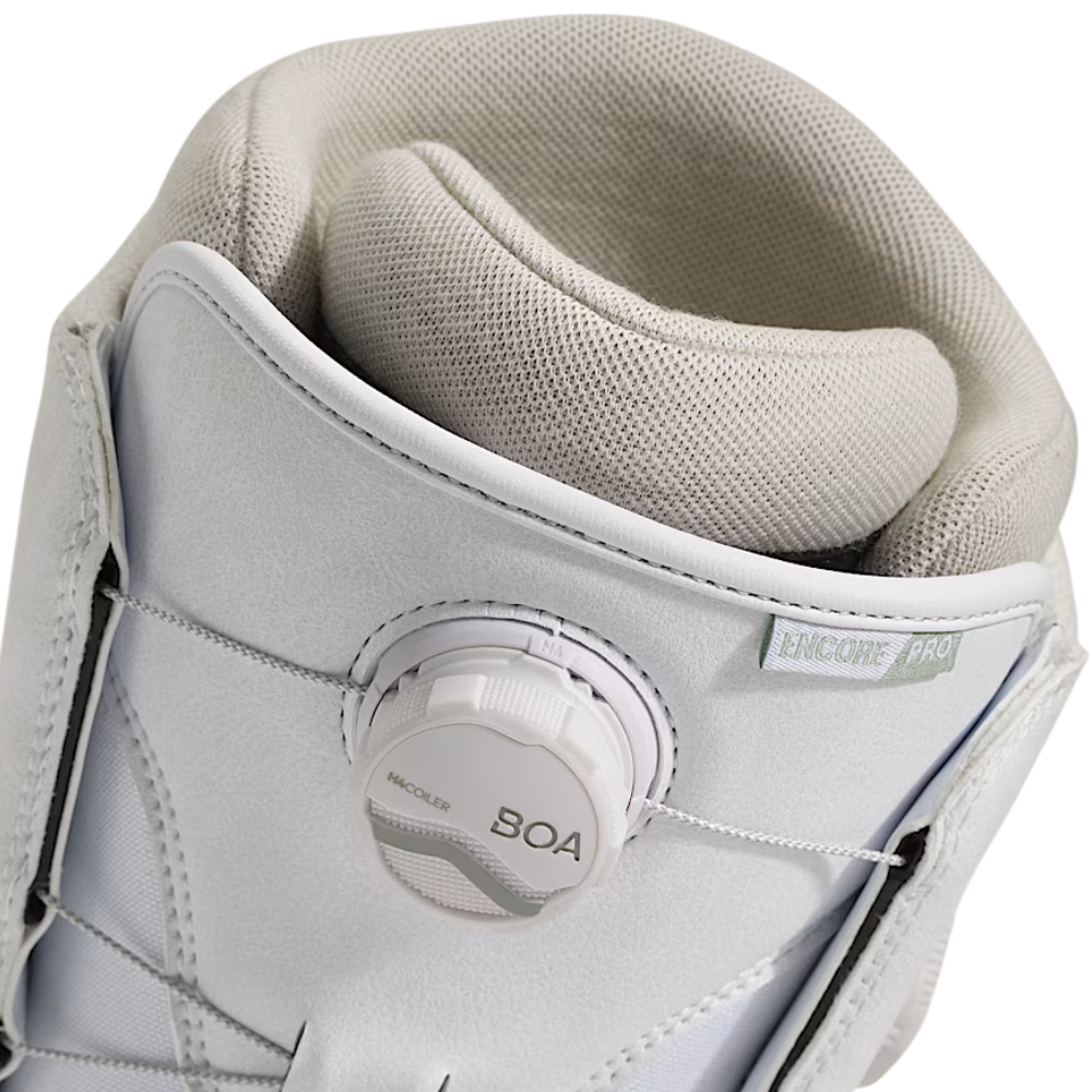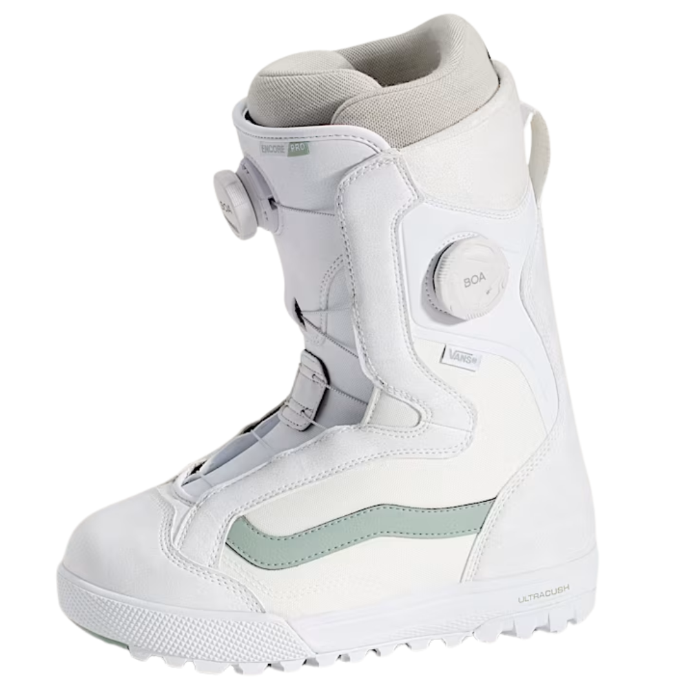 Die Vans Womens Encore Pro 30th Anniversary White/Gray Oliv Snowboard Boots sind eine stylische Anspielung auf 30 Jahre Vans Snowtradition - aber mit all der modernen Technologie, die du brauchst, um den Berg zu begeistern. Diese limitierte Auflage ist für Progression, Performance und Pow-Turns mit Flair gebaut.